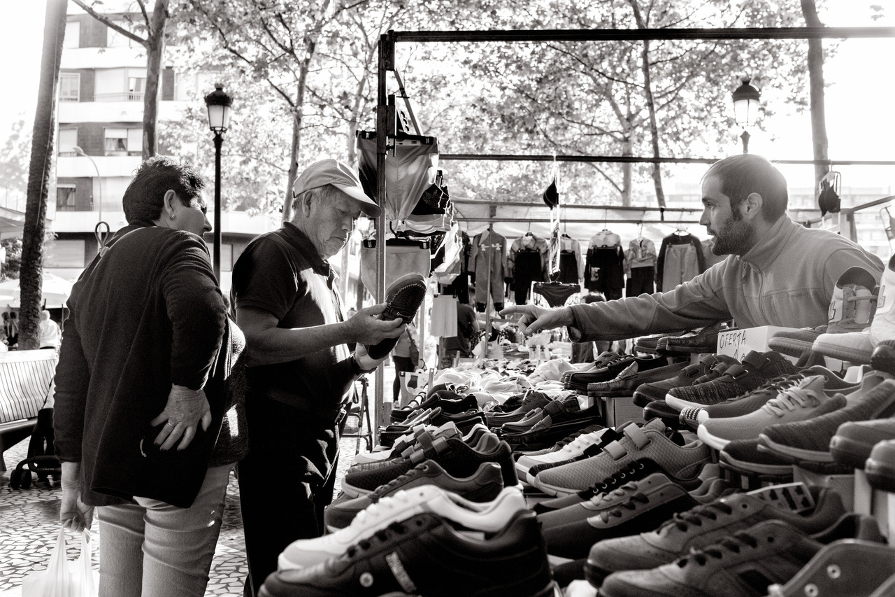 Durante varios días me quedé pensativo intentando encontrar esa vida de barrio que podría ilustrar una bonita imagen. Lo más fácil era buscar las fotografías en el mercadillo que todos los martes y sábados montan en el paseo. Allí, en la zapatería de Subi hice una foto que me encantó, el vendedor resolviendo las dudas de su cliente, ofreciendo muy buen servicio.